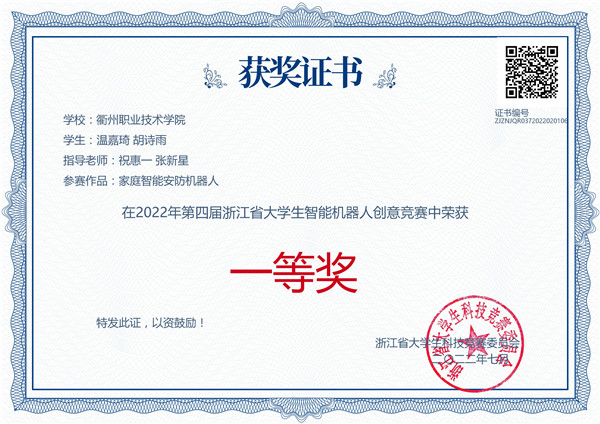 祝惠一、张新星老师指导员工参加2022年第四届浙江省老员工智能机器人创意竞赛获一等奖