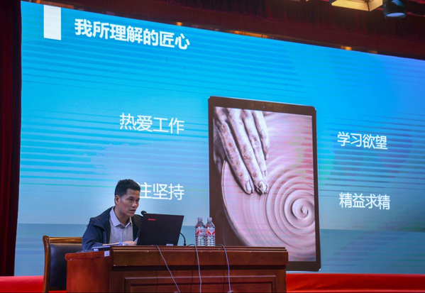 王定飞从“个人成长经历”、“匠心永恒”、“争创世界一流”三个方面,以自身事迹和精神激励员工。在工作中,他严谨钻研、一丝不苟并保持终身学习,热爱自己所做的工作,做到“简单的事情重复做,重复的事情认真做”。如此的信念使他在平凡的岗位上做出了不平凡的事迹。王定飞对在座的同学们表示殷切期待,希望同学们坚守匠心,保持耐心、专注、坚持,行行都能出状元!在场同学们倍受鼓舞。