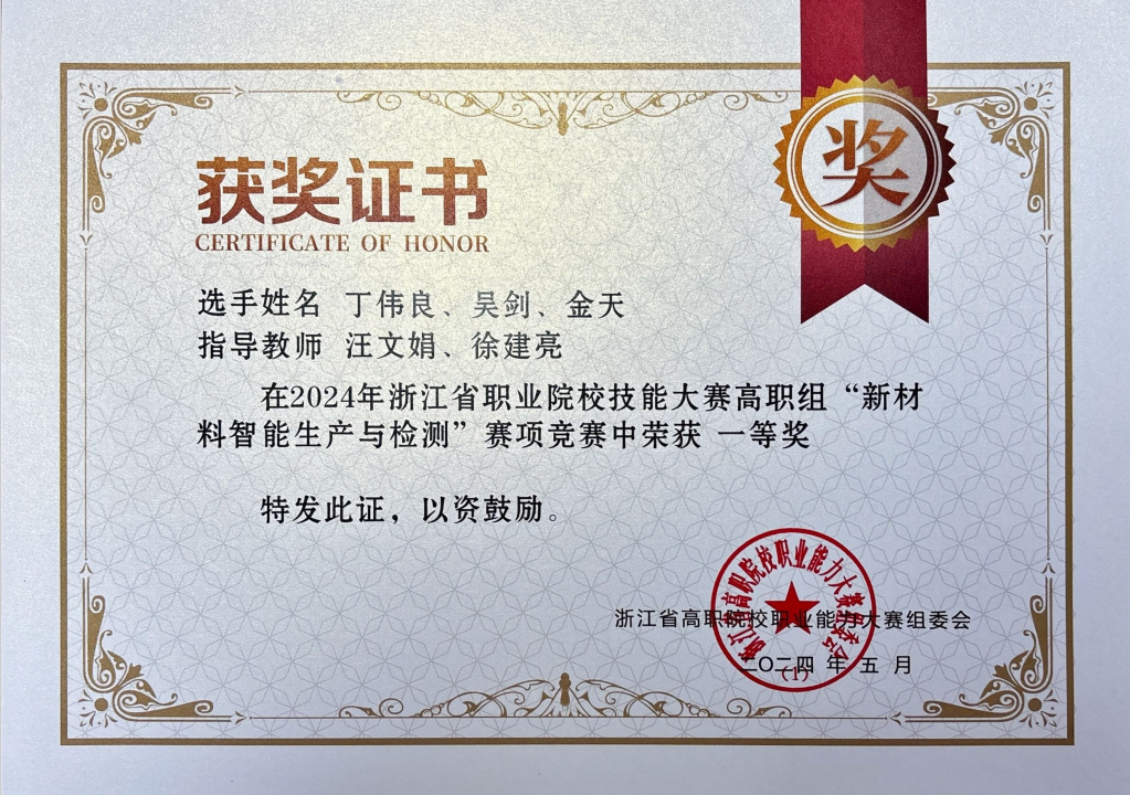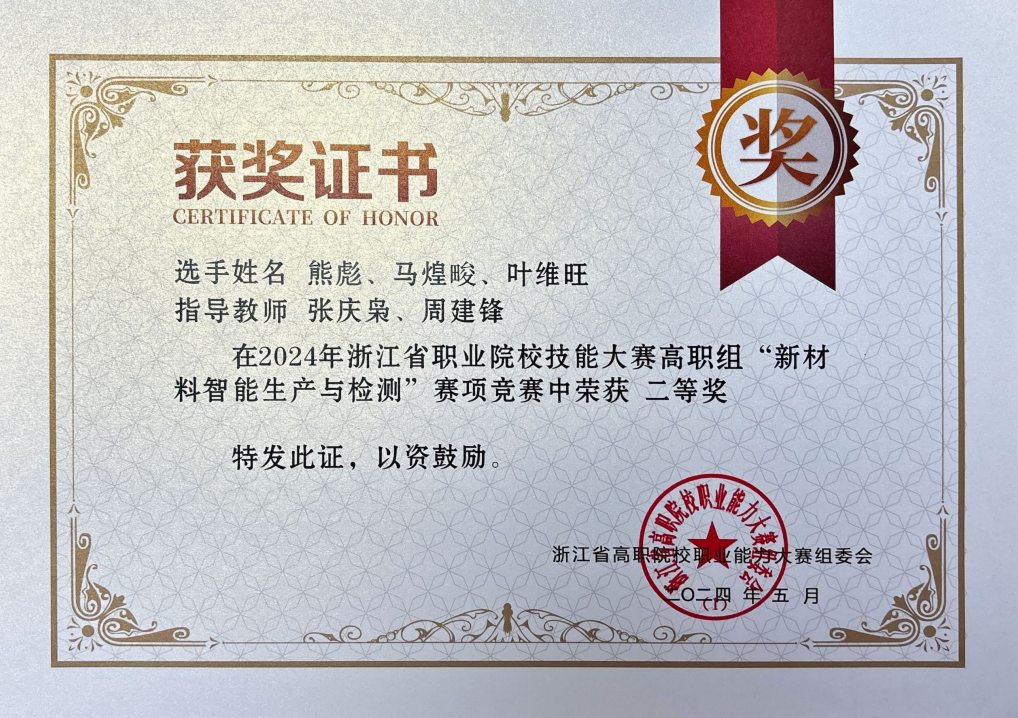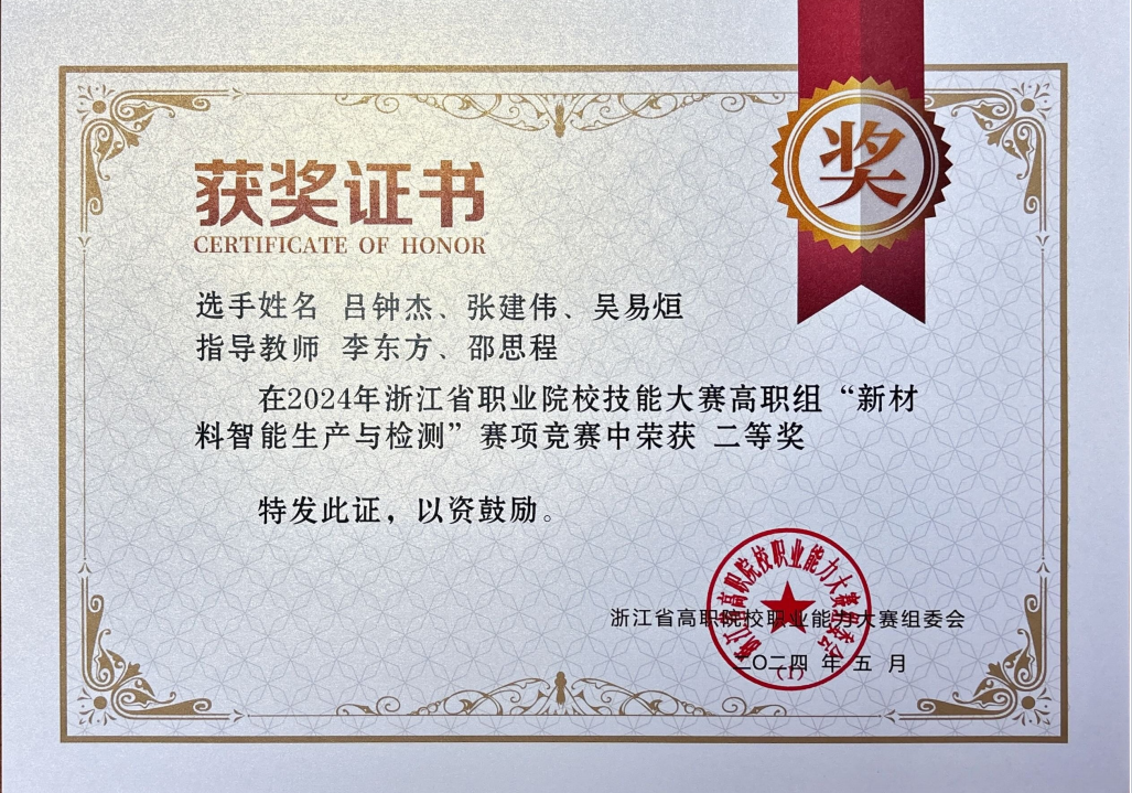 近日,2024年浙江省职业院校技能大赛中捷报频传,支部师生在多个赛道表现优异,收获一等奖1项、二等奖1项、三等奖2项的好成绩! 支部党员教师汪文娟、徐建亮指导,22机制专业员工丁伟良、吴剑、金天参与的赛项“新材料智能生产与检测”获一等奖,机制专业员工马煌畯、叶维旺以及张建伟、吴易烜参加该赛项收获二等奖2项,支部党员教师舒慧建、林钰珍参与该赛项获教师团体二等。