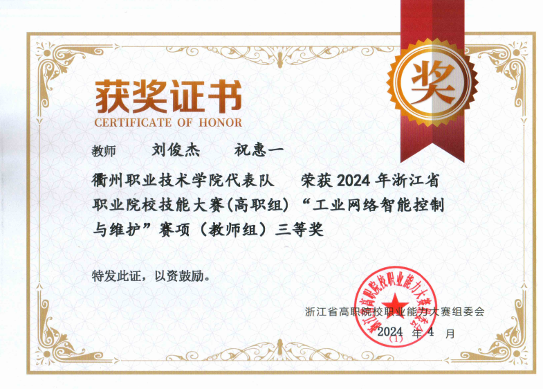 支部党员教师祝惠一参与指导,22机器人专业员工谢楷晋、楼周杲参与的赛项“工业网络智能控制与维护”获三等奖,党员教师祝惠一参与该赛项获教师组三等奖。