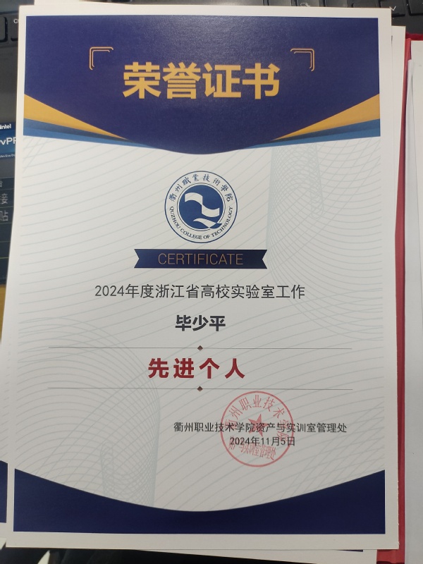 毕少平被评为浙江省高校实训工作先进个人